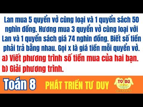 » Hai bạn Lan và Hương cùng vào hiệu sách. Lan mua 5 quyển vở cùng loại và 1 quyển sách 50 nghìn đồng. Hương mua 3 quyển vở cùng loại với loại vở của Lan và 1 quyển sách giá 74 nghìn đồng. Số tiền phải trả của Lan và Hương là bằng nhau. a) Gọi x (nghìn đồng) là giá tiền của mỗi quyển vở. Viết phương trình biểu thị tổng số tiền mua sách và vở của hai bạn Lan và Hương là bằng nhau. b) Giải phương trình nhận được ở câu a để tìm giá tiền của mỗi quyển vở.