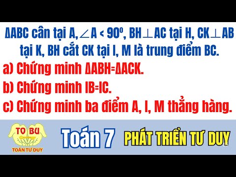 » Cho ∆ABC cân tại A, (∠A nhỏ hơn 90o). Kẻ BH vuông góc với AC tại H và CK vuông góc với AB tại K. Biết BH và CK cắt nhau tại I. a) Chứng minh ∆ABH=∆ACK. b) Chứng minh IB=IC. c) Gọi M là trung điểm BC. Chứng minh ba điểm A, I, M thẳng hàng.